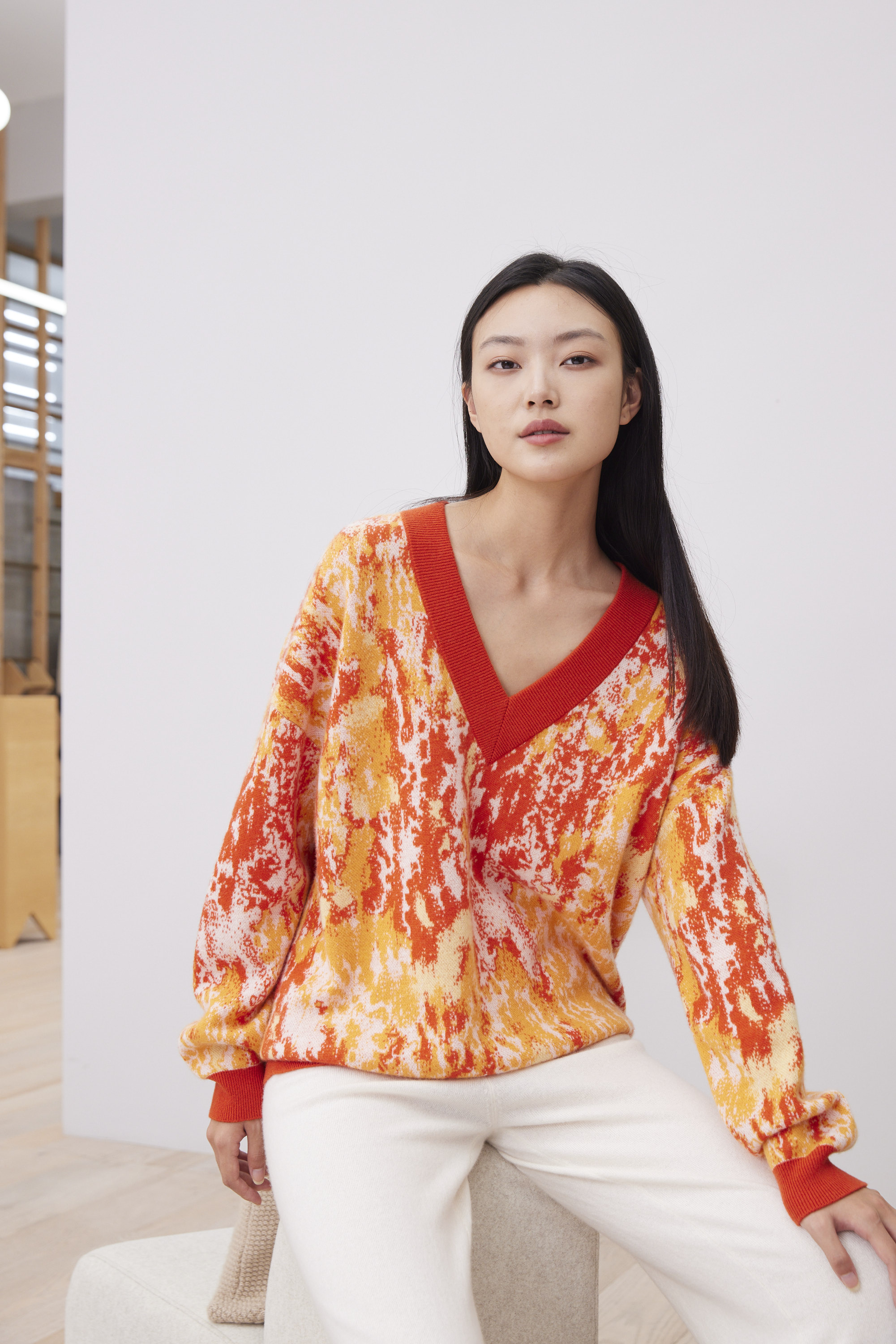 2023秋日印象舒适休闲多色提花羊绒V领上衣。多色抽象的色彩碰撞勾勒出神秘梦幻的热情天地,细密热烈的高级色彩直击内心,带来不同寻常的全新体验。不同于传统多色偏厚的工艺,成衣纱线更加细腻柔软。