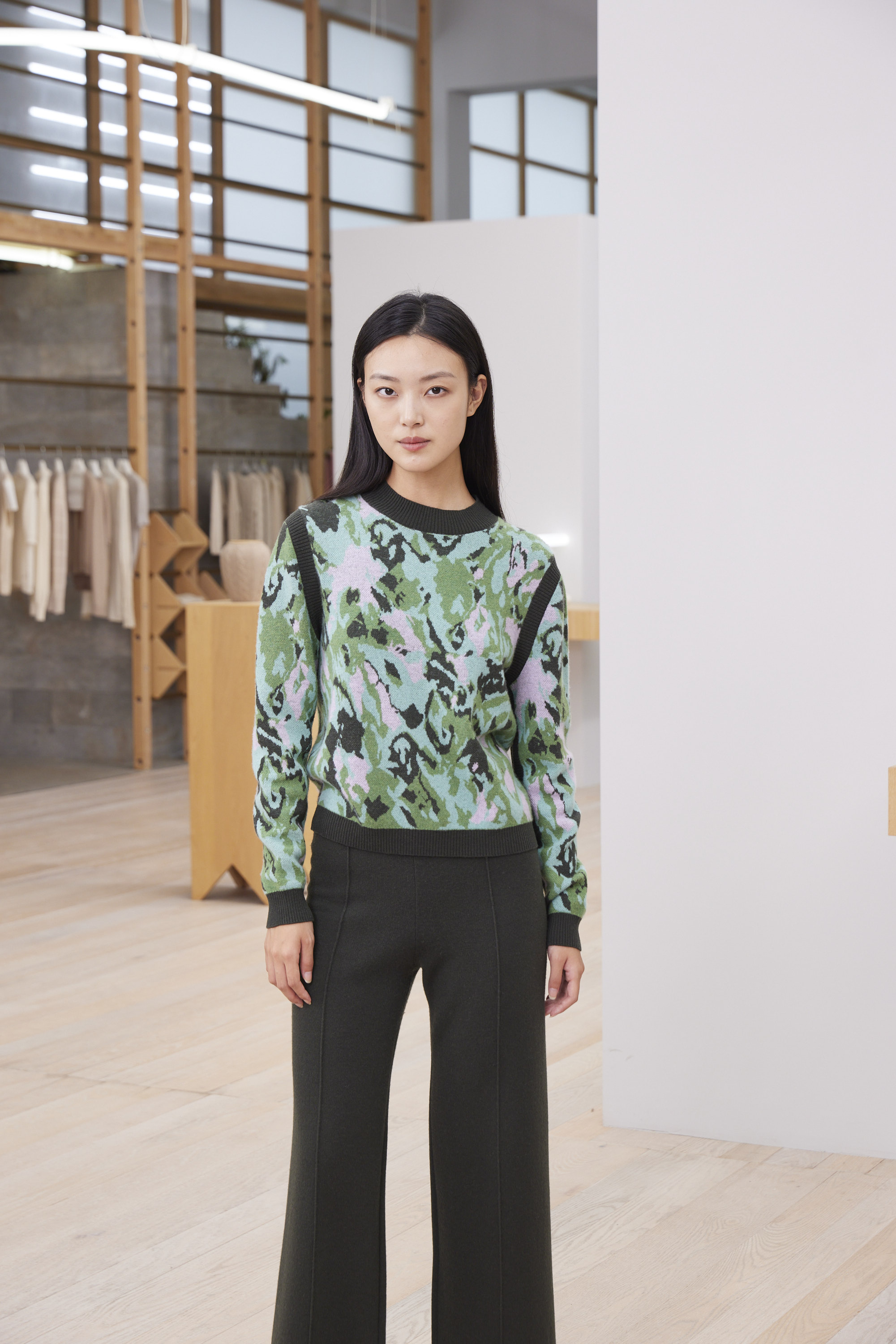 2023秋日印象多色提花针织长袖圆领上衣。多色抽象的色彩碰撞勾勒出神秘梦幻的绿色天地,不同于传统多色偏厚的工艺,成衣纱线更加细腻柔软,面料上身轻薄舒适,轻盈自如,尽显独特魅力。